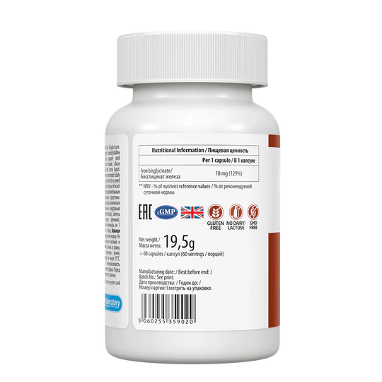 Ingredients: Iron bisglycinate, bulking agents (microcrystalline cellulose, pregelatinized corn starch), vegan capsule shell (hypromellose), anti-caking agents (magnesium stearate, silicon dioxide)